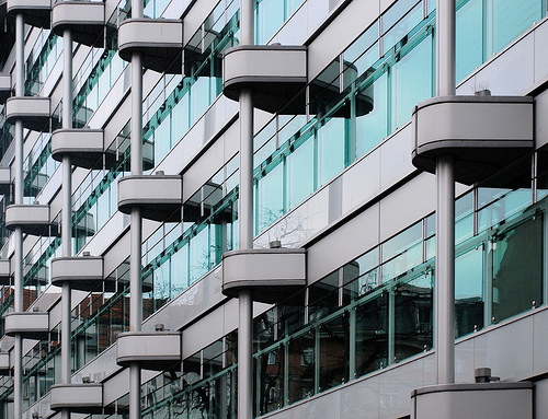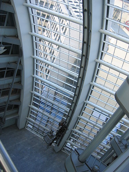 - Die Grundkonstruktion besteht aus 15 unterschiedlich ausgeformten, der Form des Grundstückes folgenden Stahlbögen. Von diesen sind die einzelnen Geschoßdecken abgehängt.